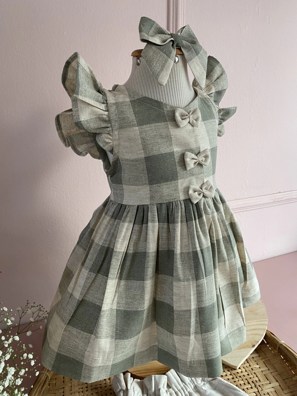 Disponível em três opções de cores xadrez: verde oliva, bege e azul, este conjunto vai encantar as pequenas fashionistas.