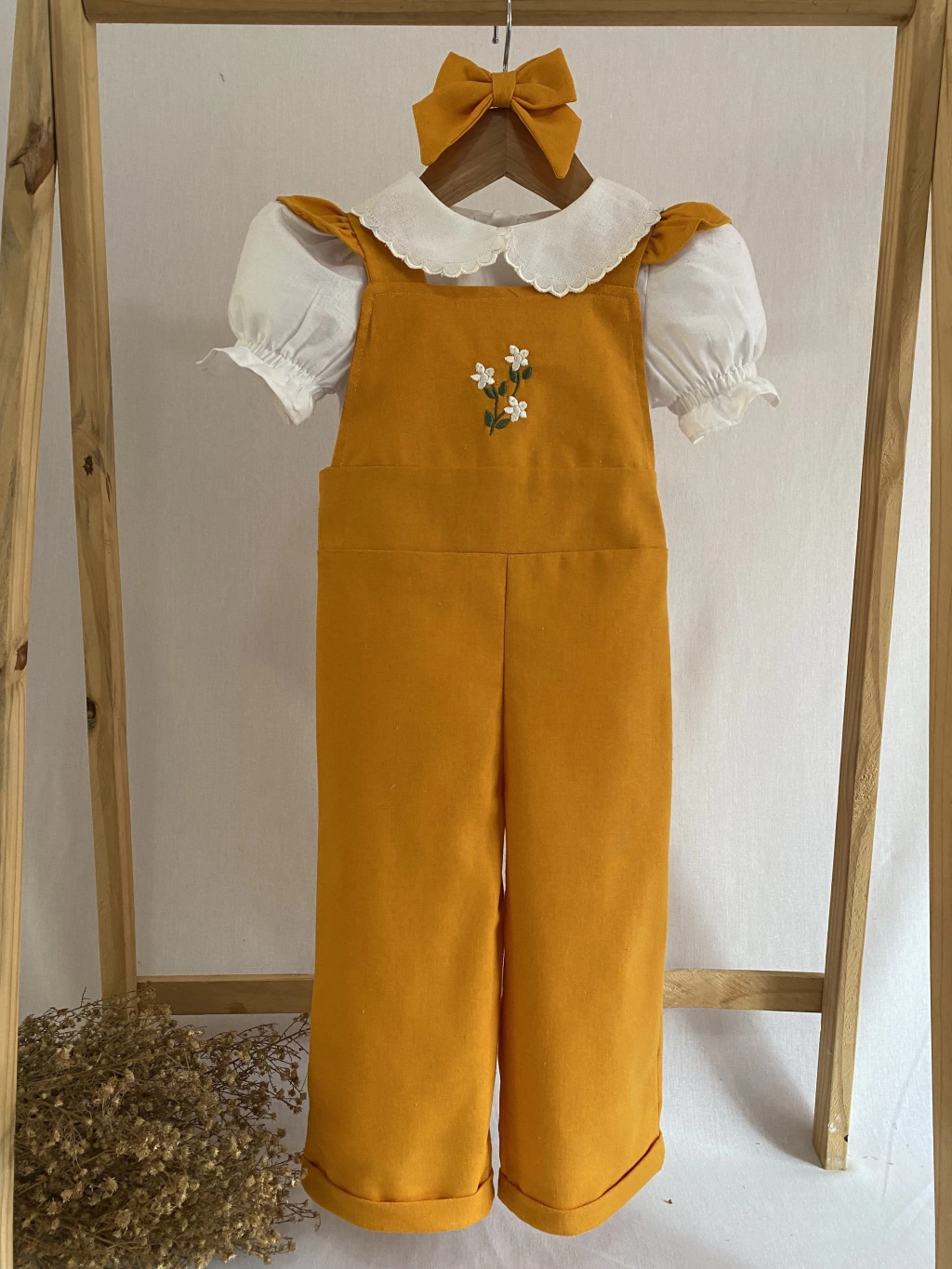 Apresentamos a Jardineira Encanto. Feita de Linho, confeccionada com uma luxuosa mistura de 85% linho e 15% viscose, garantindo conforto e qualidade incomparáveis. Seu design é adornado com um delicado bordado floral, enquanto o babado na parte de trás adiciona um charme extra. Com um acabamento de alfaiataria impecável, esta jardineira está disponível nos tamanhos P ao 6 anos, por apenas 119,90. E para completar o look, acompanha um belo laço de cabelo. Um conjunto perfeito para momentos especiais!